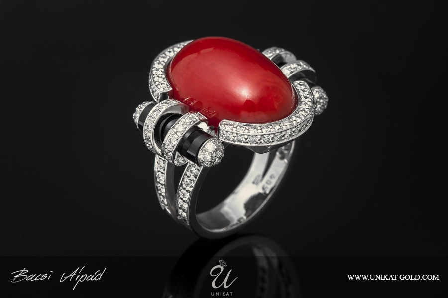 Glamozurni prsten od belog zlata sa koralom, oniksom i brilijantima